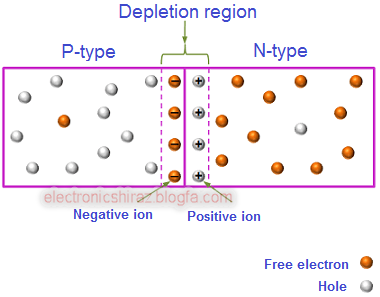 در طول این فرایند، برخی اتمهای خنثی نزدیک پیوند در طرف نیمه رسانای نوع N، الکترونهای خود را از دست میدهند و تبدیل به یونهای با بار مثبت میشوند. به طریق مشابه، برخی اتمهای نزدیک پیوند در سمت نیمه رسانای نوع P، الکترونهای اضافی به دست میآورند و تبدیل به یونهای با بار منفی میشوند. این یونهای مثبت و منفی در پیوند P-N، در واقع همان ناحیه تخلیه را ایجاد میکنند. ناحیه تخلیه از عبور جریان بیشتر از پیوند P-N جلوگیری میکند.