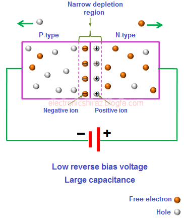 زمانی که یک ولتاژ بایاس معکوس به دیود خازنی اعمال شود، الکترونها از ناحیه نیمه رسانای نوع N و حفرهها از ناحیه نیمه رسانای نوع P از پیوند دور میشوند. در نتیجه عرض ناحیه تخلیه افزایش مییابد و ظرفیت خازنی نیز کاهش مییابد. با این حال، اگر ولتاژ بایاس معکوس بسیار پایین باشد، ظرفیت خازنی دیود مقداری بسیار بزرگ خواهد شد. مقدار کاپاسیتانس دیود خازنی به صورت معکوس با عرض ناحیه تخلیه و به صورت مستقیم با مساحت نواحی نیمه رسانای نوع P و نوع N متناسب است. بنابراین مقدار ظرفیت خازنی با افزایش عرض ناحیه تخلیه، کاهش مییابد. در تصویر زیر نمایی از یک دیود خازنی هنگام اعمال بایاس معکوس کوچک نشان داده شده است.